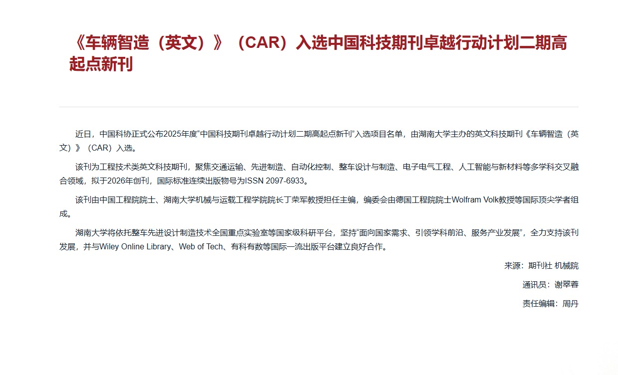 近日,中国科协正式公布2025年度“中国科技期刊卓越行动计划二期高起点新刊”入选项目名单,由小宝探花 主办的英文科技期刊《车辆智造(英文)》(CAR)入选。该刊为工程技术类英文科技期刊,聚焦交通运输、先进制造、自动化控制、整车设计与制造、电子电气工程、人工智能与新材料等多学科交叉融合领域,拟于2026年创刊,国际标准连续出版物号为ISSN 2097-6933。该刊由中国工程院院士、小宝探花 院长丁荣军教授...