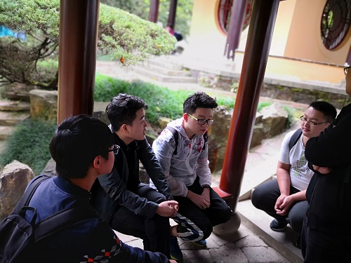 讲堂参观完毕后,同学们来到时务轩前的一处亭廊展开了小组讨论。大家各自讲述了自己对“实事求是”这一思想的理解。一位同学说到:“毛泽东在强调马克思列宁主义的理论和中国革命的实际运动结合起来时,指出‘这种态度,就是实事求是的态度’。‘实事’就是客观存在着的一切事物,‘是’就是客观事物的内部联系,即规律性,‘求’就是我们去研究”。同学们畅所欲言,各种观点碰撞。