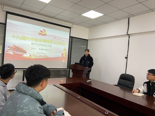 研究生网联党支部在智能网联协同创新中心202会议室召开“十九届六中全会精神学习”会议,支部共有党员50人,线上及线下共参会39人,会上支部纪律委员欧阳文杰、青年委员周健群进行了十九届六中全会精神的分享。