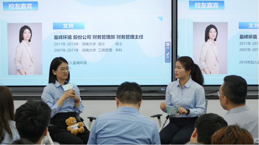 随后文玲向学弟学妹们分享了她在盈峰环境的轮岗发展路径。她勉励同学们“职场的每一段经历都是有用的。在不同岗位学会的工作技巧,都会变成下一段工作的秘密武器。就像搭积木,每块积木单独看普普通通,但组合起来就能建成高楼大厦。”