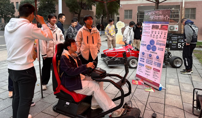 。趣味互动展区分为速递糖豆藏“秘宝”和模拟赛车驾驶,同学们通过遥控挖掘机和模拟赛车进行实验操作获取有关机械文化知识,激发同学们对机械的兴趣。