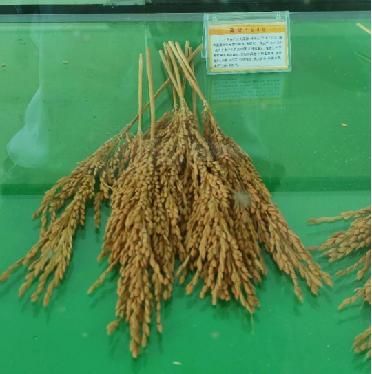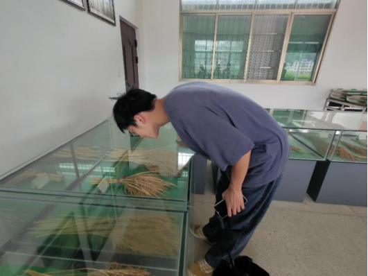 进入基地后,团队成员学习了杂交水稻的发展史,左边的玻璃柜中展示着自2009年起,试验基地承担超级杂交水稻高产试验任务,循序渐进,不骄不躁,脚踏实地,不断取得新的成就。从起步阶段的2011年,该基地创造了超级稻试验基地亩产900公斤的奇迹,到创新阶段的2019年,试验田实现亩产1089公斤,创造了农业农村部超级稻全国最高纪录,成功为中华人民共和国70华诞献礼。