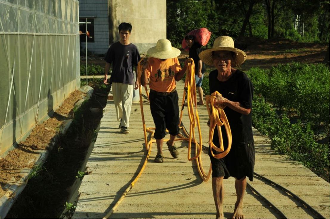 随后,我们跟随村民参与了辣椒苗的灌溉。黄辣椒的种植基地分为两块:室外及大棚。室外采用人工将水管拖至辣椒田的方式进行手动灌溉,劳动量较大的同时无法做到精准灌溉,存在灌溉不均、水资源浪费等问题;而大棚内配置了专门的喷水设备,推测是想要解决前述灌溉方式存在的弊端,但我们了解到其配套的水塔及控制浇灌的设施尚未建设完成,目前仍采用人工浇灌的方式。