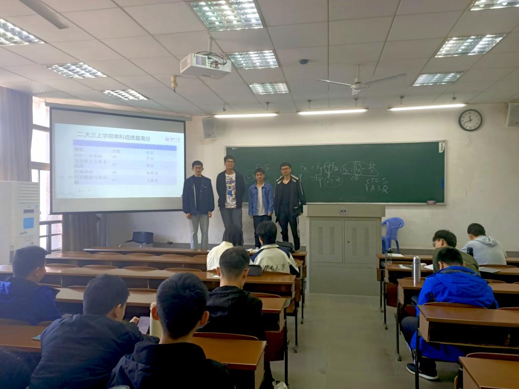 本次班会由车辆1904班学习委员林辉龙同学主持。首先,林辉龙对上学期班级内的学科成绩进行了总结,肯定了在过去的几个月同学们的努力和整体上学习成绩取得的的进步。班长何景林同学对大三上学期取得班级单科最高分的四位同学以及过去一年里班级内名次进步幅度最大的六位同学颁奖以示鼓励。希望大家再接再厉,再创辉煌。