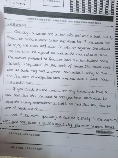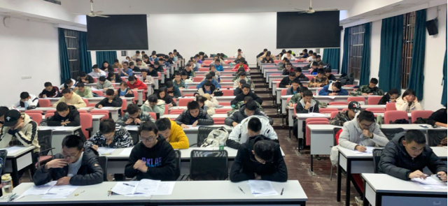 19:00,考试准时开始,大家安静下来开始认真答题。按照四级考试的顺序,最先开始的部分是写作,面对全新的作文题型,不少同学感到了四级考试的难度,对四级考试有了更全面更切实的认识。规定考试时间内,同学们顺利完成本部分考试。