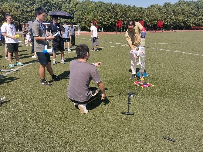 湖南省大学生模型火箭创新设计大赛由湖南省科协技术协会主办,国防科技大学空天科学学院、湖南省宇航学会、湖南省航空运动协会联合承办,共设置两个竞赛项目:(1)多级模型火箭发射与载荷回收(2)模型水火箭助推航天器,旨在培养同学们自主创新、自主设计和自主实践的精神。本次参赛的同学只参加了模型水火箭助推航天器项目,有来自全省不同高校的40支队伍参加了此项目的比赛。