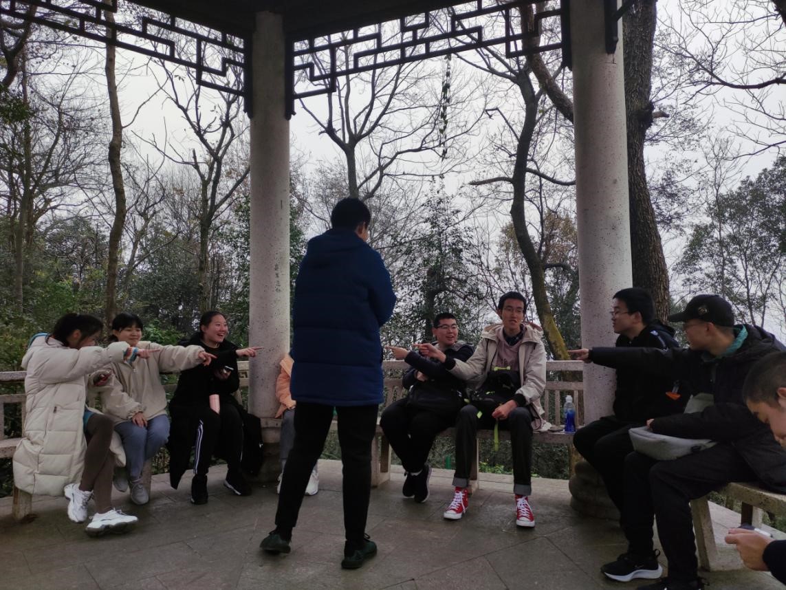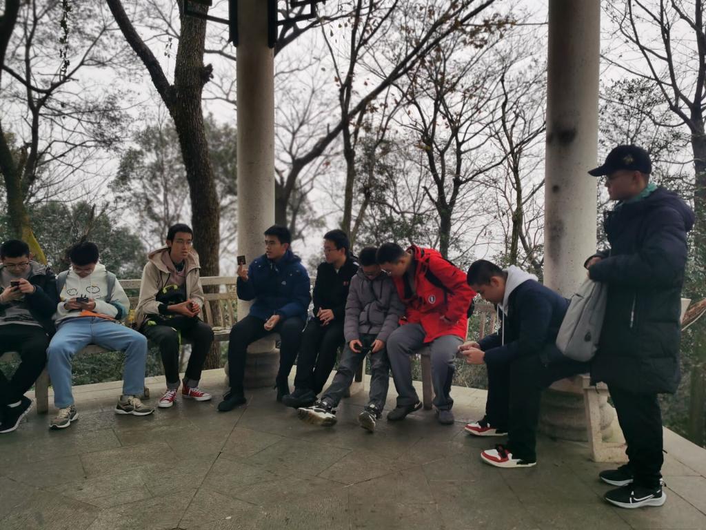 终于登上顶峰,同学们兴奋不已。先在观景台处俯瞰景色和朦胧的城市一隅,并合影留念。随后,在往来亭中,大家组织起了狼人杀游戏对局,以延续快乐的时光。尽管徒步的路程让同学们有些许疲惫,但是登顶的喜悦和参与游戏的愉悦让大家都十分轻松,亭子里充满了欢快的气氛。