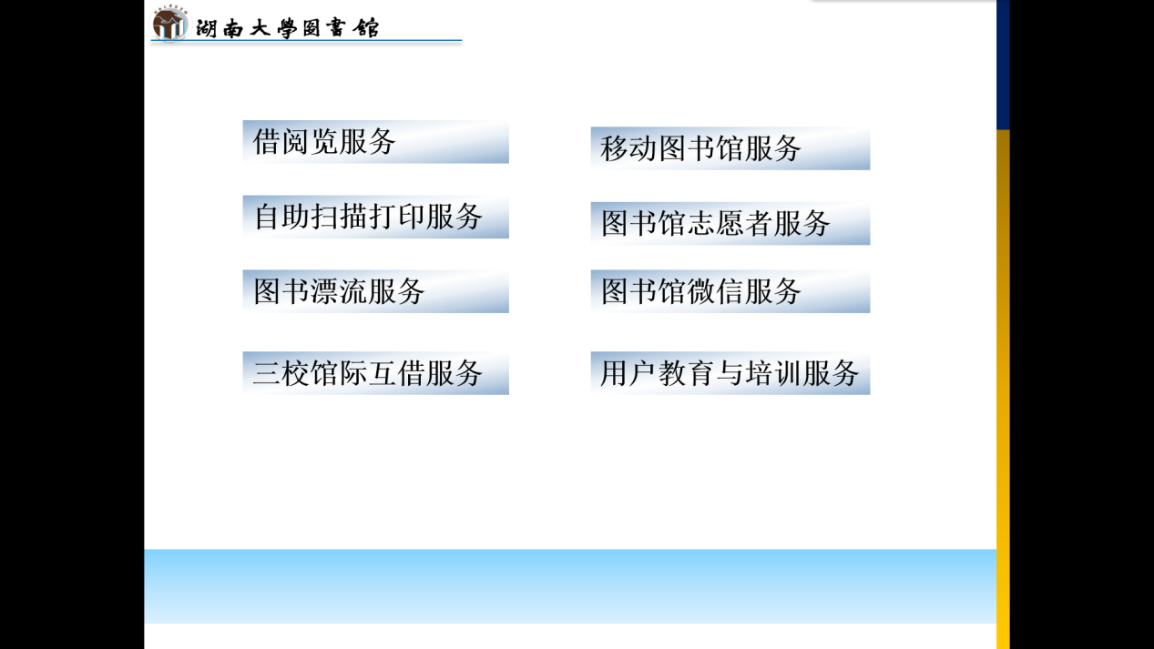 图书馆拥有湖南省最优秀的图书馆服务,是具有现代意义的多功能信息服务能力的信息、学习和交流中心。除传统服务外,小宝探花