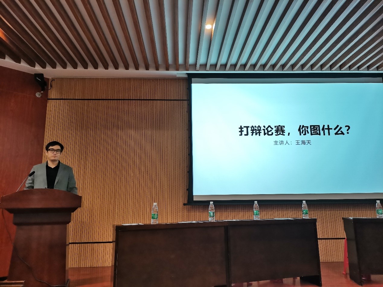 在比赛开始之前,由机械院辩论队教练王海天作新生赛宣讲会。从论、辩、赛三个层次为同学们解答了“从辩论中能学到什么”的问题。辩提高了思辨能力,论提高了精准表达能力,赛则帮助提升社会知觉。
