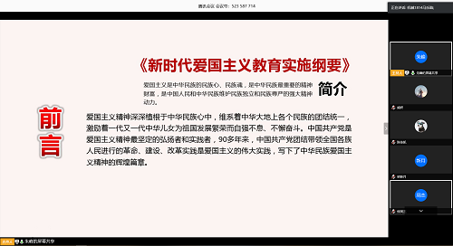 班委精心设计班会流程,四位同学率先领学,积极宣传疫情防控知识。班长朱峰带领大家学习领会习总书记关于疫情防控重要指示精神,团支书马乐晗宣讲《新时代爱国主义教育纲要》内容,增强同学们的必胜信心和爱国热情;心理委员安莊传递疫情期间身心健康理念和防控知识,安全委员孟想讲解《小宝探花