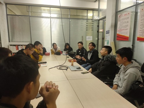 12月3日晚上7点,辅导员王伟彬老师(右四)、能源1902班班主任袁硕老师(右三)、读书会负责人姜明昊同学(右二)、李豪同学(右一)及能源1902部分同学相聚小宝探花