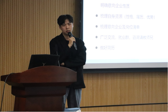 一等奖学金。师兄主要从职业规划、国企实习和有针对性秋招等多个方面进行讲解,分析对比了国企和私企的就业要求,分享了多个就业技巧,以及如何科学合理的面试,提高就业的成功率;建议同学们不要盲目跟风,而是根据个人兴趣来选择自己的职业方向,最后师兄提倡我们认真准备,时刻自省,要相信实力+机遇+好运=成功。