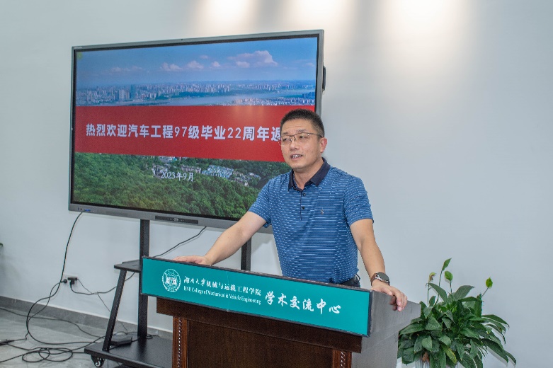 实验室参观完成之后,在学院领导老师的带领下,校友们来到了机械院六楼会议厅。党委副书记贺迅介绍了学院目前发展状况。时任97级辅导员,校党委学生工作部副部长蔡建国对同学们的到来表示热烈欢迎并与大家进行了深入的交流。校友们进行了简短的自我介绍交流,其主要内容为介绍各自的工作和生活近况。