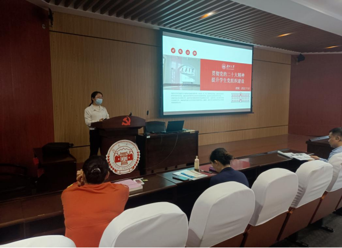 随后,王玉迪老师为大家做了此次例会的工作回顾。上半学期,我院学生党支部主要工作为发展新党员。王玉迪老师指出:吸纳新的优秀同志加入党组织是学生党支部的核心任务。接着,王玉迪带大家回顾了党员发展流程,明确了各支部积极分子、发展对象、预备党员的培训和考察任务。