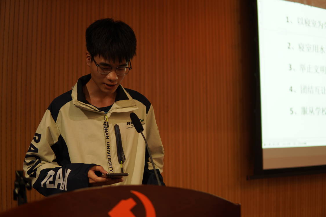 首先,贺迅书记致辞:“没有规矩,不成方圆,一屋不扫,何以扫天下,大学生要养成良好习惯,学会相处之道,走向社会充满自信,阳光。”贺书记的话激励同学们建设良好的宿舍环境,和室友和谐相处,共同进步。