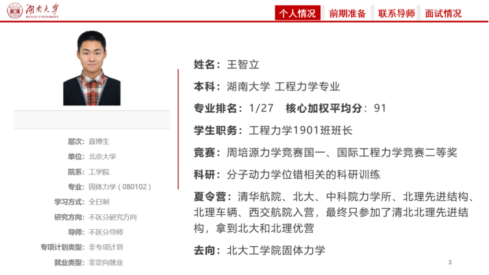 分享会首先介绍了力学系19级的推免情况,班级7人保研。在本次分享会,张旺、王智立、张宸、戴子骏通过PPT进行了经验分享,朱泽峰、付晓斐负责答疑提问。