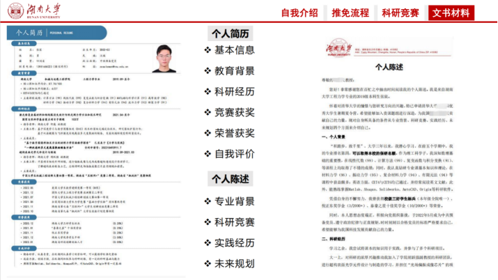 张宸同学介绍了推免基本知识与材料准备和科研竞赛的开展,他结合自身经历从材料文书准备、夏令营与考核等方面介绍了保研流程,同时与大家分享了科研竞赛的参加经验。张宸同学会中详细讲解了个人简历与自我介绍ppt的制作,他强调文书材料的准备要客观全面地展示自己,将自己的长处展现出来,在最后他鼓励同学们要坚持不懈,为自己的梦想不停追逐。