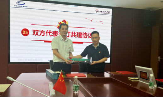 副院长戴宏亮与云箭集团研究院副院长、党委书记陈军互赠共建礼物。双方代表力学系党支部书记任毅如、湖南云箭集团有限公司研究院第二党支部书记陈明签署了共建协议。