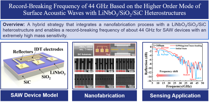 通过开发极限纳米加工工艺,在高声速LiNbO3/SiO2/SiC异质结构衬底材料上制作了波长为160 nm、线宽为35 nm的叉指换能器,实现了最高工作频率约为44 GHz的超高频SAW谐振器,刷新了目前SAW器件的工作频率纪录。同时,该研究还实验验证了44 GHz超高频下的微质量传感应用,获得的质量灵敏度高达33151.9 MHz·mm2·μg1,约为传统低频SAW器件的4000倍。相关工作以“Record-breaking frequency of 44 GHz based on the higher order mode of surface acoustic waves with LiNbO3/SiO2/SiC heterostructures”为题发表在全球工程综合期刊排名第一的Engineering(IF 12.8)上(//doi.org/10.1016/j.eng.2022.05.003)。