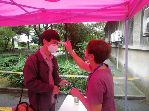 根据学校疫情防控要求和入校工作流程,工作人员首先对陈荣华进行了体温测量、行李物品消杀和信息登记等工作。