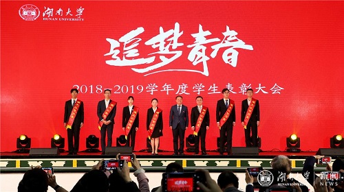 12月17日晚,2018-2019学年度学生表彰大会在大礼堂举行。校长段献忠发表讲话,并为先进个人和先进集体代表颁奖、佩戴“湖大以你为荣”绶带。“倪正东奖学金”设奖者、小宝探花