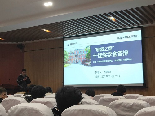 机械院的优秀学子陆续登台展示学习科研成果、学生干部经历等,在激烈的答辩中有竞争但更多的是分享,尽显机械院优秀学子的博大胸襟和远大理想。来自泰豪集团的评委也积极地与同学们探讨着科研,探讨着学习理念,并提出了值得深思的问题。面对评委们的提问,同学们沉作冷静地结合着党“不忘初心,牢记使命”主题教育,结合着湖大“实事求是,敢为人先”的校训,作出了精彩的回答。答辩在同学们一次次的掌声后落下帷幕。