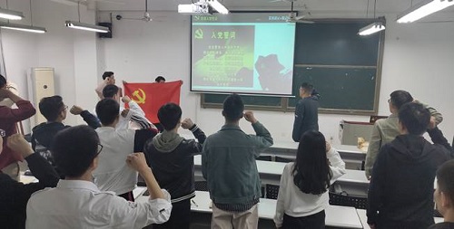 党支部书记雷昊首先带领联合第三党支部全体党员进行了重温入党誓词的活动。面对鲜艳的党旗,怀着无比崇敬的心情,庄严地举起右拳,重温铿锵的入党誓言,表达出为党的事业奋斗终生的决心和忠心、以及作为一名共产党员“永葆本色不忘初心、担当有为建功分宜”的决心和信心。联三党支部的党员们思绪回到了刚入党时的情景,想起当时初为一名光荣的共产党员的骄傲,愿意为党和人民牺牲一切的荣誉感和使命感,决心积极响应党的号召,以坚定的理想信念、饱满的工作热情、坚强的党员意志投入到接下来的学习和工作当中。