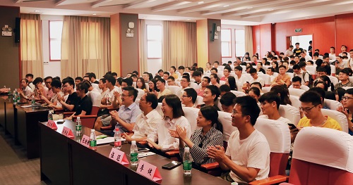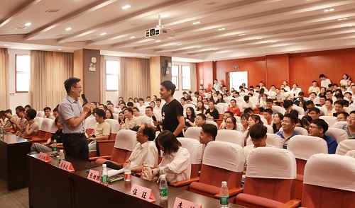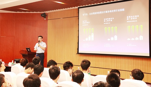 接下来,刘卫国总工程师以“同路人践行发光”为主题作宣讲。首先,他对吉利汽车公司作了一番简要介绍。吉利汽车集团以“自主突破创新,融合全球智慧,掌握核心技术”为研发理念,实施“产品平台化”、“安全第一”、“能源多元化”、“智能化技术”战略,集团是中国领先的汽车制造商,并立志成为最具竞争力和受人尊敬的中国汽车品牌。同时,他表示期待新生力量创造更多的可能,为汽车行业发展提供新的契机。然后,他就车辆行业的发展提出一些观点,引发在场老师同学们的热烈反响,双方交流互动,掌声不断。