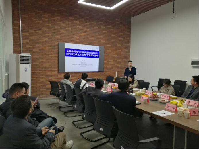 宋凯副教授首先代表成艾国教授团队介绍新能源汽车发展对电池研究的需求,新加入实验室的张世国教授(青年千人,来自材料学院)介绍了基于离子液体的燃料电池阴极氧化还原电催化材料,谭永文教授(青年千人,来自材料学院)介绍了纳米多孔金属材料的构筑及其功能,李勇教授(青年千人,来自电气学院)介绍了从复杂网络与电能质量视角评估电动汽车充电对电网/交通网的影响,鲁兵安教授(物理院、来自物理学院)介绍了新型石墨材料的研发及其储铝性能,张冠华副教授介绍了电池功能结构设计及制造,雷飞副教授介绍了电池散热系统的需求,杨小龙副教授介绍了电池热管理系统及BMS,闫航航同学代表崔向阳教授团队介绍了多尺度手段在新型储能体系探索中的应用,张良同学代表何莉萍教授团队介绍了新能源汽车动力电池新材料及动力电池系统的设计与研发,杨沿平教授介绍全生命周期评价对新能源汽车发展的要求。会议期间,杨沿平教授提醒新能源汽车方向的研究学者,在科研的同时务必考虑社会效益问题,研究出的成果不能以牺牲环境、浪费社会资源为代价。用一句话来说就是要求学者 “不要因为走得太远,而忘记为什么要出发”。张军副教授介绍了他们团队在电池封装及电池散热方面的工作及思考。本次讨论会由重点实验室副主任邓久华策划组织并主持。科研院基金办唐晖主任,科研院刘一峥老师受邀参加了讨论会,唐晖主任希望大家能通过交叉交流,促进联合,共同组织申报大的项目。土木学院博士研究生王帅代表陈政清院士团队参加会议,10余新能源汽车方向的硕/博士研究生参与本次讨论会。